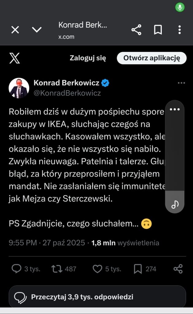 „Robiłem dziś w dużym pośpiechu spore zakupy w IKEA, słuchając czegoś na słuchawkach. Kasowałem wszystko, ale okazało się, że nie wszystko się nabiło. Zwykła nieuwaga. Patelnia i talerze. Głupi błąd, za który przeprosiłem i przyjąłem mandat. Nie zasłaniałem się immunitetem jak Mejza czy Sterczewski.