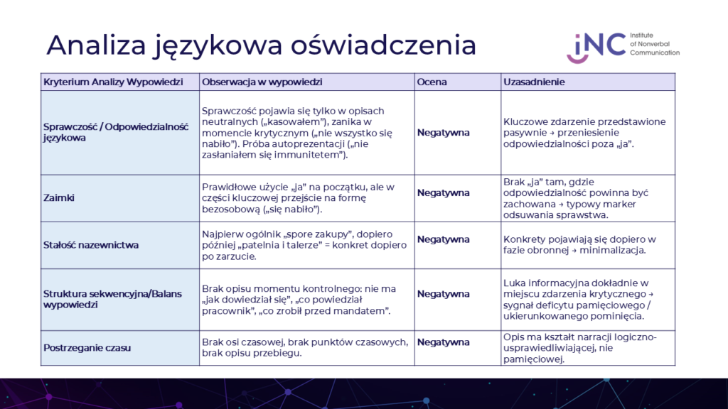 W związku z tym, że oświadczenia publiczne w sytuacjach kryzysowych mogą pełnić funkcję zarówno wyjaśniającą, jak i wizerunkowo-defensywną, poddano je analizie lingwistycznej i behawioralnej. Celem analizy nie jest ustalenie winy ani intencji prawnej, lecz ocena wiarygodności przekazu na podstawie struktury językowej, zgodnie z metodologią FBI (Linguistic Statement Analysis) oraz uzupełnioną o zasady CBCA i SVA.